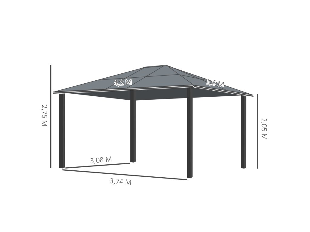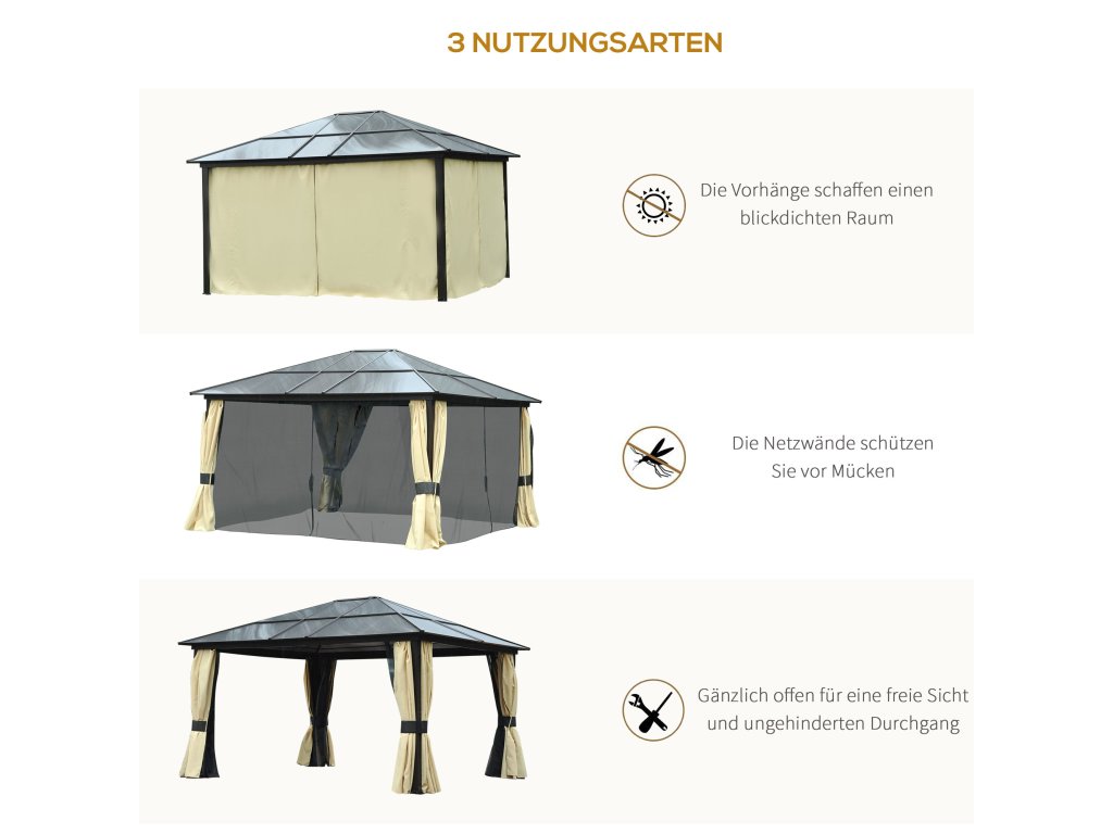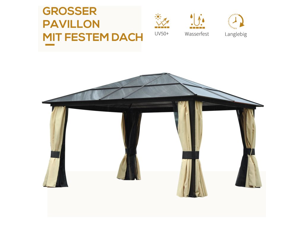 - Luxusní altán: Náš velký altán s pevnou střechou o rozměrech 4,2 x 3,6 m je skutečným snem pro vaši zahradu: Vysoce kvalitní, odolný a moderní vzhled vám bude neocenitelným společníkem v horkém létě.