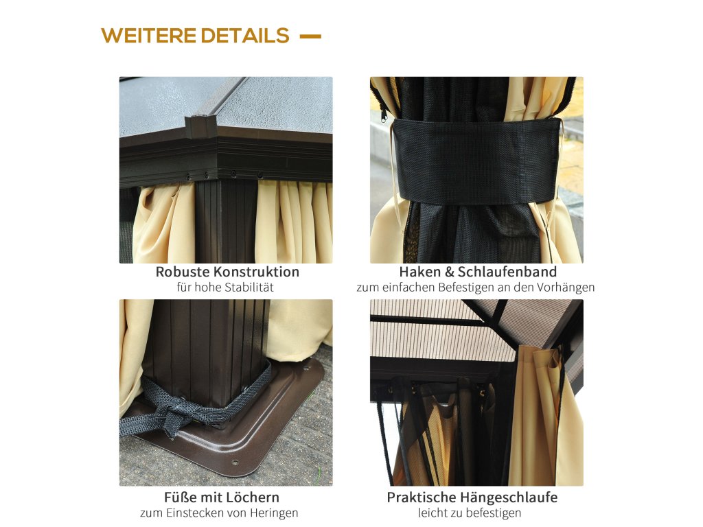 - Stabilita: Rám pavilonu se mimořádně snadno staví a je vyroben z práškově lakovaného hliníku, který je odolný vůči povětrnostním vlivům a velmi robustní.