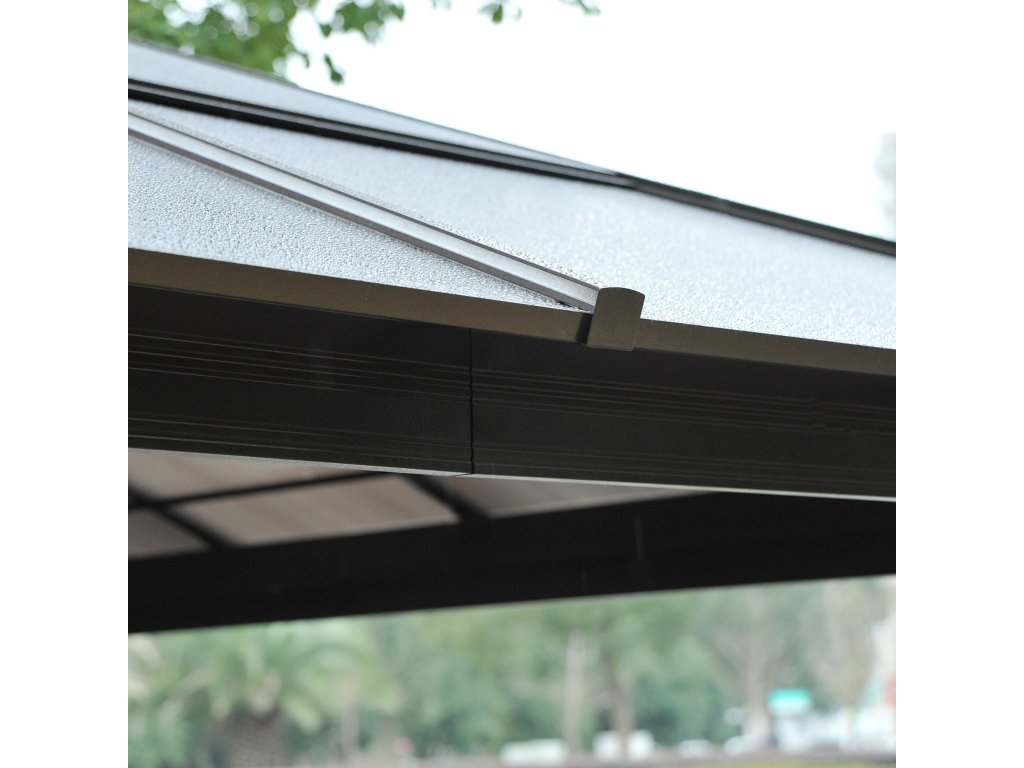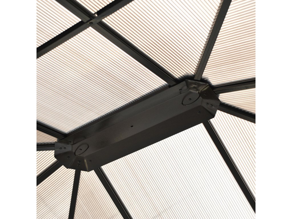 - Polykarbonátová střecha: Průsvitná střecha pavilonu je vodotěsná a chrání před deštěm, větrem a UV zářením. Díky tloušťce 7 mm je střecha velmi robustní a odolná.