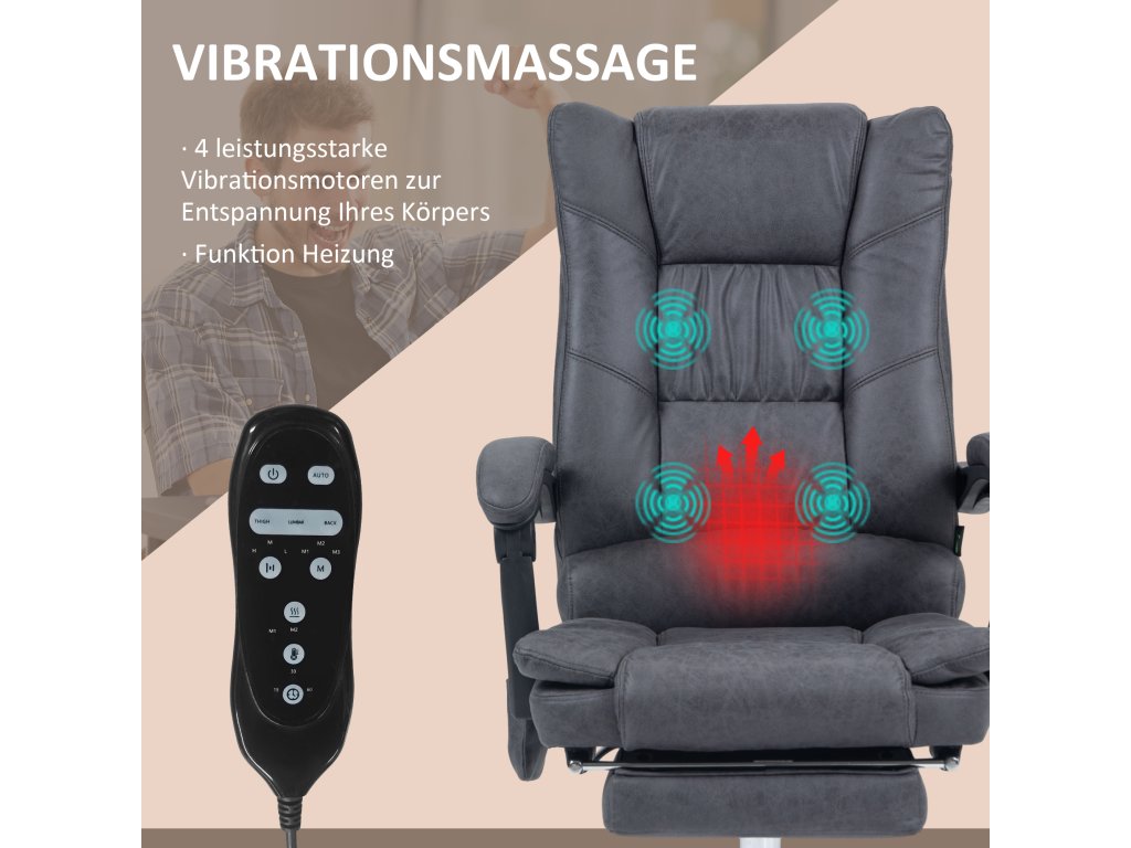 - Vibrační masáž a vyhřívání: Pokud trpíte bolestmi zad, protože celý den sedíte, tato kancelářská židle má čtyřbodovou vibrační masáž se třemi masážními režimy, třemi úrovněmi intenzity a třístupňovým vyhříváním bederní části, které zabraňuje únavě a uvolňuje tělo. Dálkové ovládání umožňuje volit mezi masáží, vyhříváním a časovým nastavením