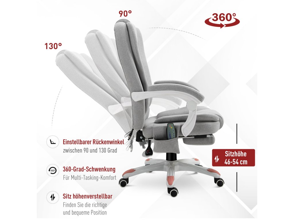 - Nastavitelnost: Náklon až 130 stupňů a ergonomický design, takže si můžete zvolit svůj oblíbený úhel náklonu. Silná pěna je velmi pohodlná a do tohoto masážního křesla se zaboříte. Výšku sedadla můžete flexibilně nastavit podle svých zvyklostí při sezení a výšky stolu