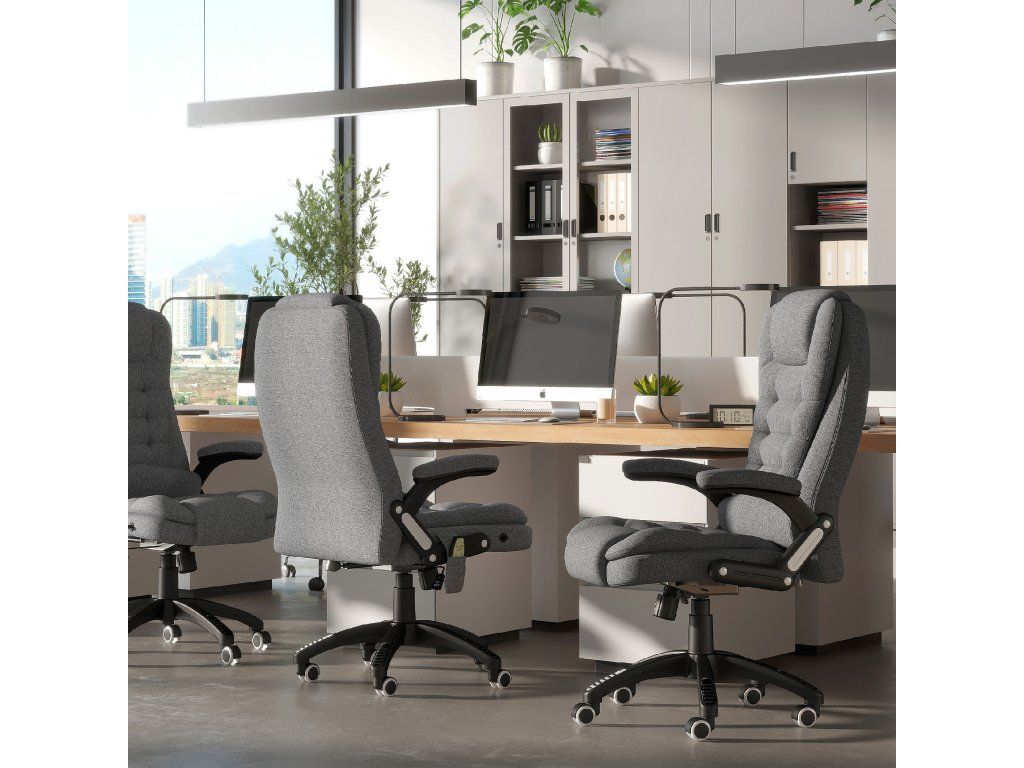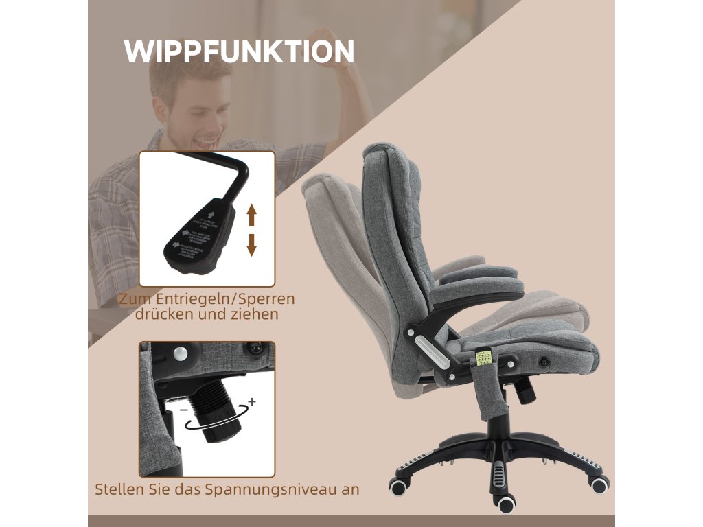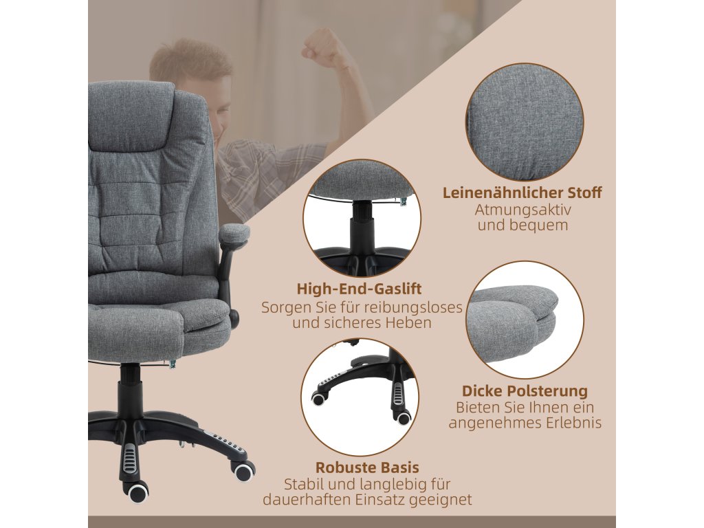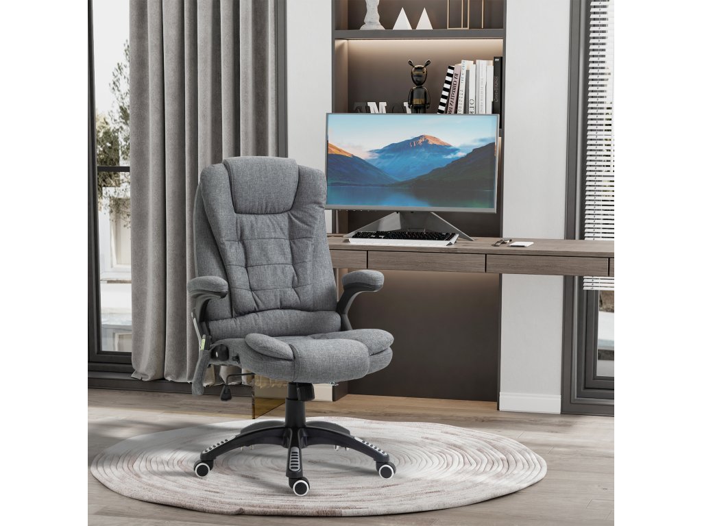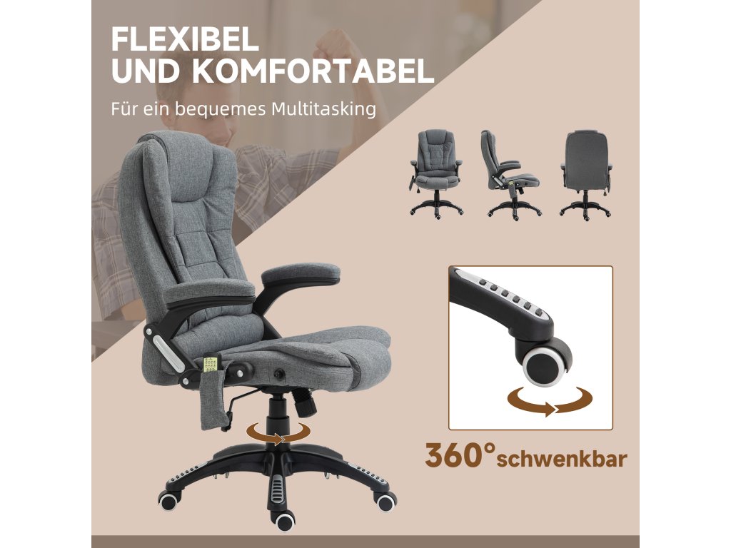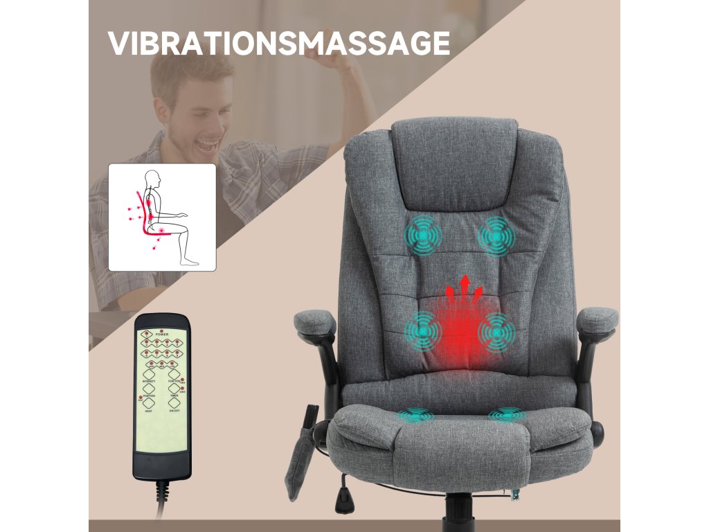 Toto manažerské křeslo od společnosti Vinsetto nabízí nejen pohodlné místo k sezení, ale také dokonalou relaxaci díky masážní funkci a vyhřívacím prvkům. Udělejte si pohodlí na měkkém čalouněném sedadle, opřete se až o 130° díky nastavitelnému opěradlu a pohodlně ovládejte masáž pomocí dálkového ovladače. Prodyšný potah masážního křesla zajišťuje pohodlné sezení při jakékoli teplotě.