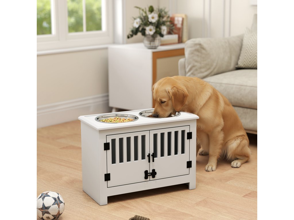 - Prostorný úložný prostor: Pod sadou misek pro psy se nachází velký úložný prostor, který je ideální pro přehledné uložení krmiva, hraček a příslušenství pro domácí mazlíčky, aby nebyly na očích