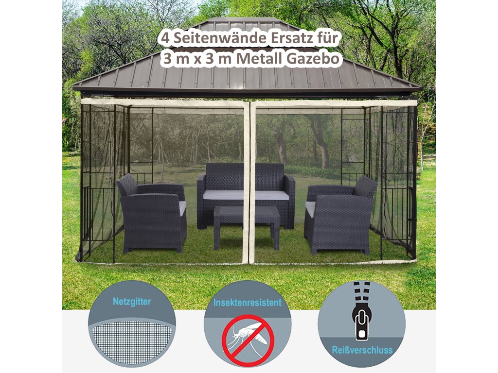 - Podrobnosti o výrobku: Naši moskytiéru lze použít univerzálně. Naše síťka proti komárům se hodí do standardních čtyřpanelových altánů. Jedná se pouze o síť; kovový rám a vrchní část stříšky nejsou součástí dodávky. Vhodné pro altán 3x4