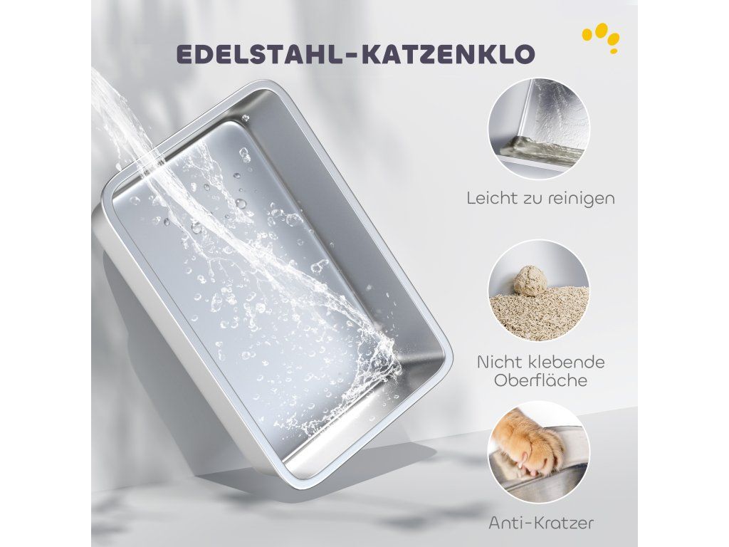 - Robustní nerezová ocel: Tato vanička na stelivo je vyrobena z nerezové oceli 201, je obzvláště odolná proti poškrábání a prasklinám a nabízí vaší kočce hygienické, trvanlivé a snadno čistitelné prostředí.