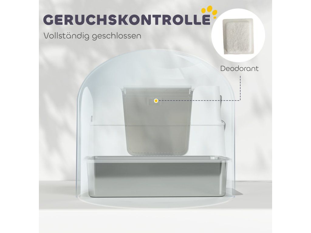 - Uzavřené víko pro kontrolu zápachu: Průhledné víko a dvířka stelivové misky zajišťují diskrétnost, zatímco větrací štěrbiny a přihrádka na neutralizátory zápachu udržují okolní vzduch příjemně svěží.