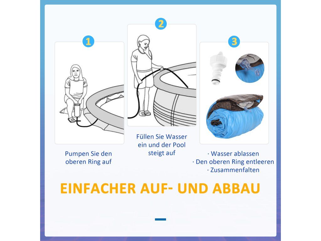 - Rychlé sestavení: Rychlé sestavení: Vyberte vhodné místo na zahradě a nafoukněte horní prstenec, abyste bazén sestavili, a bazén se sám postaví, jakmile se naplní vodou.