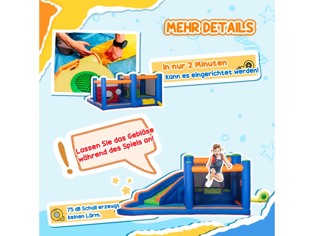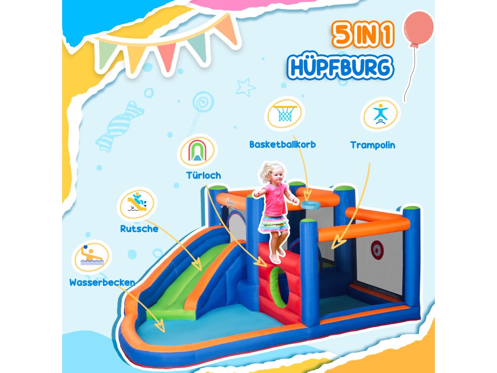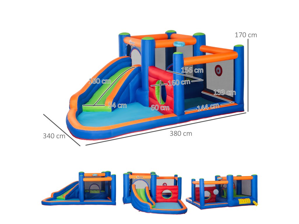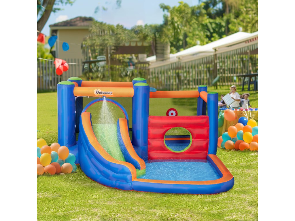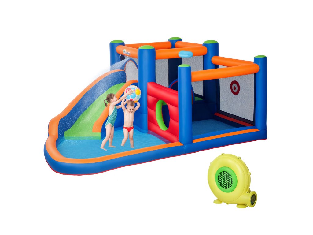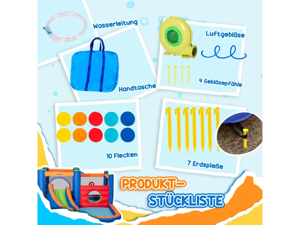 Nafukovací skákací hrad Outsunny, vodní park s nafukovačem, skluzavkou, basketbalovým košem, hrací centrum pro děti od 3 let, ideální na zahradu | Aosom.de