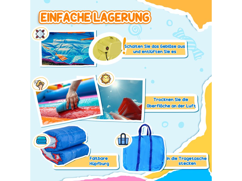- Rychlá montáž a demontáž: Součástí dodávky je kvalitní elektrické 450W vzduchové dmychadlo, které dětský skákací hrad nafoukne během pouhých dvou minut. Vyfouknutí je také velmi rychlé, takže hrad můžete snadno složit a uložit do přiložené tašky.