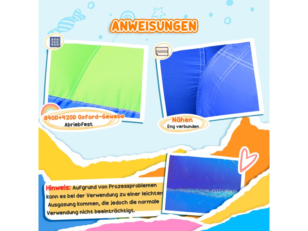- Bezpečný a odolný: Bezpečnost je nejvyšší prioritou. Robustní kolíky vám pomohou udržet vodní park bezpečně na místě. Vnější materiál s vysokou hustotou je odolný vůči povětrnostním vlivům a dostatečně pevný, aby udržel tři děti najednou. Dbali jsme také na to, aby součástí balení byly 2 záplaty v každé barvě pro snadnou opravu.