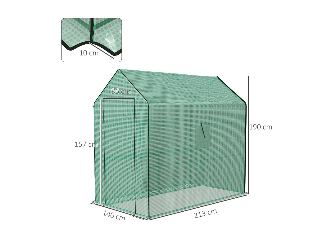 - Rozměry: 140L x 213W x 190H cm. Dveře: 86Š x 157V cm. Výška okna: 30Š x 30V cm. Vhodné pro skleník Outsunny: 845-411V02.