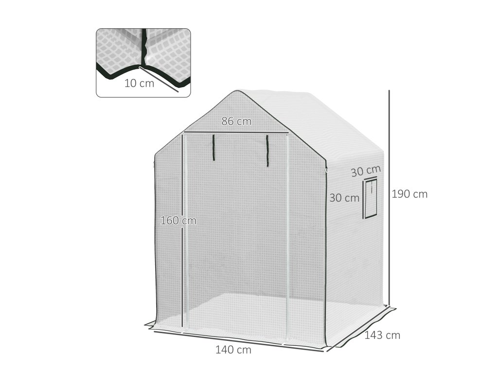 - Údaje o výrobku skleníkové fólie: Rozměry: 140L x 143W x 190H cm, dveře: 86W x 160H cm, okno: 30W x 30H cm, vhodné pro skleník Outsunny: 845-510