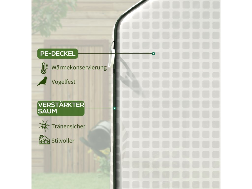 - Zesílený PE kryt: Naše robustní dvouvrstvá skleníková fólie s 135 GSM a zesilující síťovinou spolehlivě ochrání vaše rostliny před větrem a povětrnostními vlivy a zajistí delší životnost