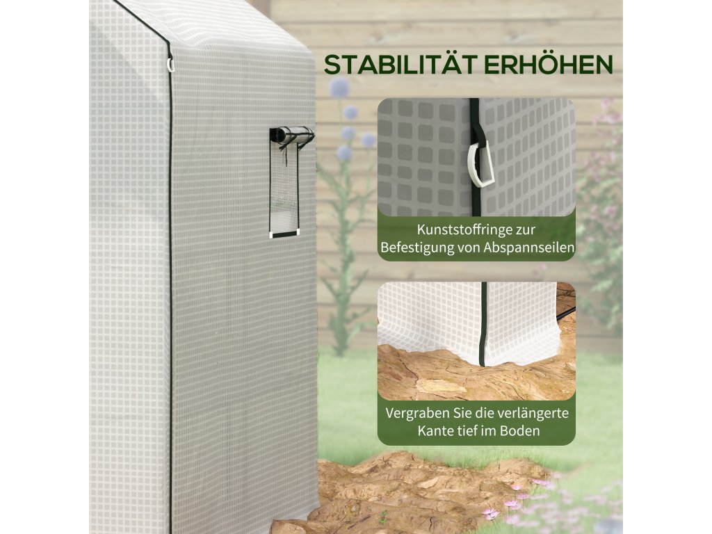 - Extra dlouhý kryt pro stabilitu: Zaryjte vyčnívající okraj skleníkové fólie hluboko do země a použijte plastové kroužky v rozích pro dodatečné upevnění pomocí kolíků
