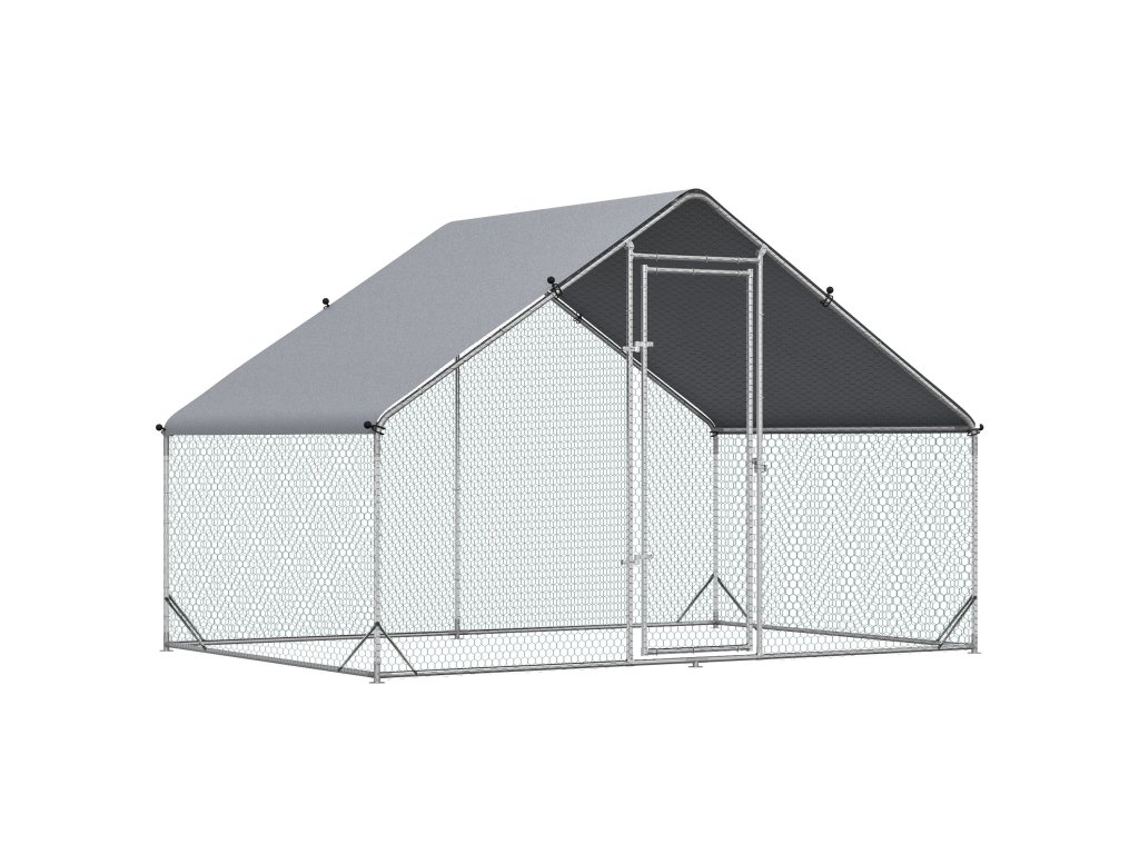 Ocelový kurník PawHut pro volný chov kuřat, 300 x 200 x 200 cm, klec pro kuřata s víkem, dvířka, výběh pro 4-6 kuřat, malá zvířata, stříbrný