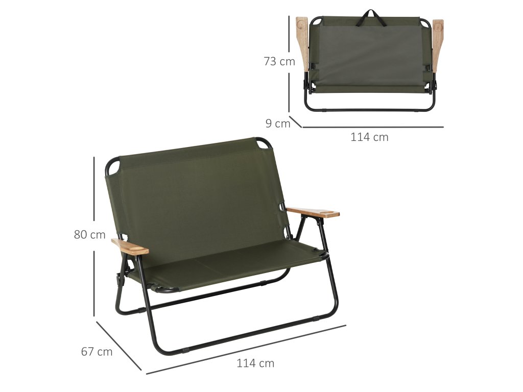 Outsunny 2místná kempingová židle, do 160 kg, zahradní židle, ředitelská židle, skládací, s držákem nápojů, ocel+Oxford tkanina+dřevo, zelená, 141x67x80cm | Aosom