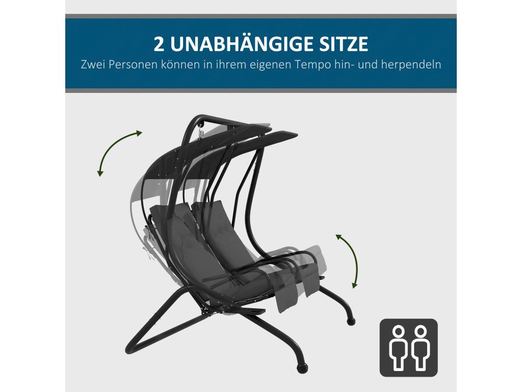 - Se sluneční stříškou: Dvě pohodlná houpací lehátka jsou zastřešená. Polyesterový potah navíc odpuzuje vodu a nečistoty. Vždy tak budete mít k dispozici útulné místo ve stínu.
