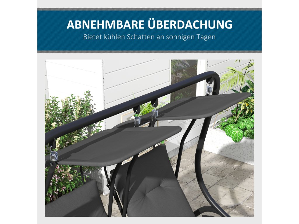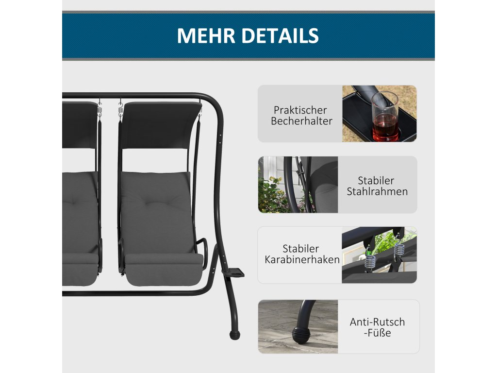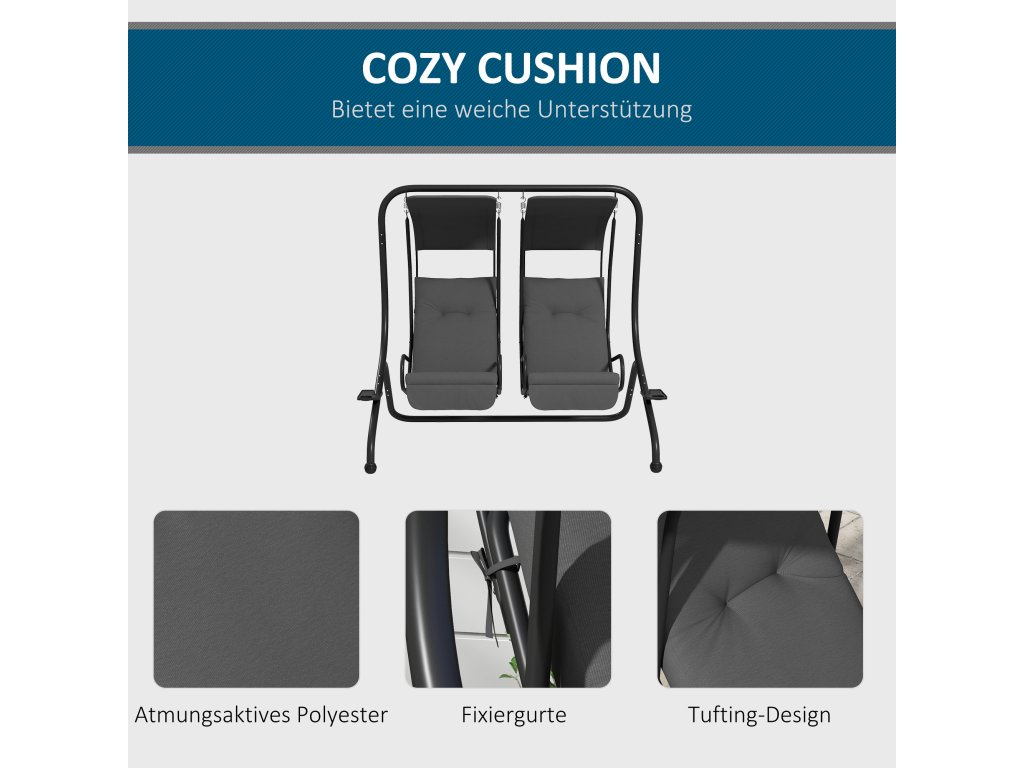 - Stabilita: Práškově lakovaný ocelový rám je hodnotný a odolá i nepříznivým povětrnostním podmínkám. Díky tomu je houpačka ideální pro použití na zahradě nebo na terase.