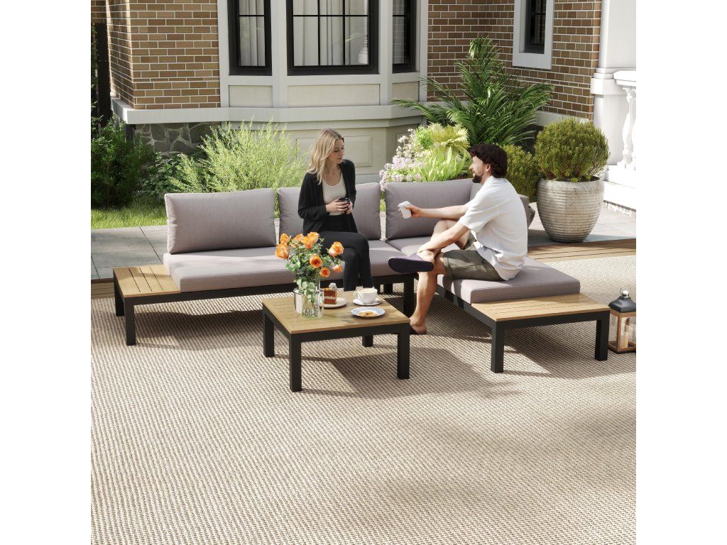 S touto třídílnou sadou zahradního nábytku se můžete vrátit k základům. Hliníkový rám zajišťuje odolnost a pevnost, je odolný proti korozi a lehký, takže můžete vše snadno přepravovat. Hustě polstrované polštáře na sedáku a opěradle zajišťují pohodlné sezení, zatímco lamelový stolek a odkládací plocha na boku pohovky poskytují dostatek úložného prostoru a snadno se čistí.
