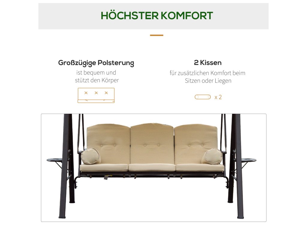 Snídejte na terase, užívejte si slunce, poseďte s přáteli a rodinou na čerstvém vzduchu: S naší zahradní houpačkou pro dospělé od společnosti Outsunny můžete pohodlně sedět za každé situace. Je zde místo až pro tři osoby, které rámuje elegantní a zároveň robustně navržený kovový rám. O další pohodlí při sezení se postará 8 cm silné čalounění a kompaktní polička na občerstvení, chladné nápoje a dobrou knihu.
