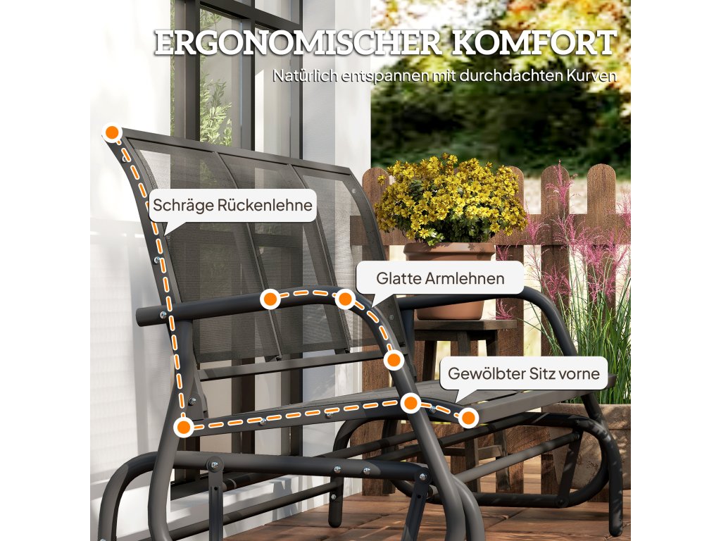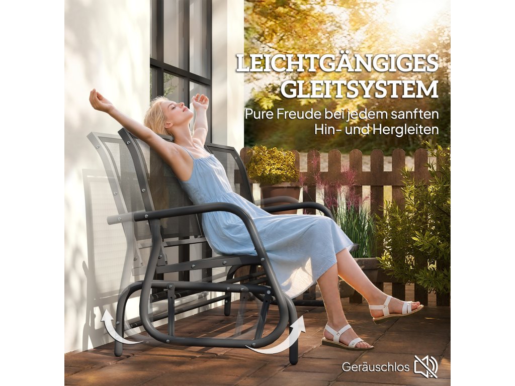 Naše vysoce kvalitní balkonové lehátko v klasickém stylu od společnosti Outsunny se skvěle hodí na vaši zahradu nebo verandu. Funkce houpání zajišťuje relaxační den na zahradě a robustní kovová konstrukce nabízí dlouhou životnost. Potah z jemné síťoviny na sedáku a opěradle je prodyšný a vybízí k pohodlnému sezení. Jednoduše se posaďte na toto skvělé zahradní houpací křeslo a nechte svou mysl bloudit.