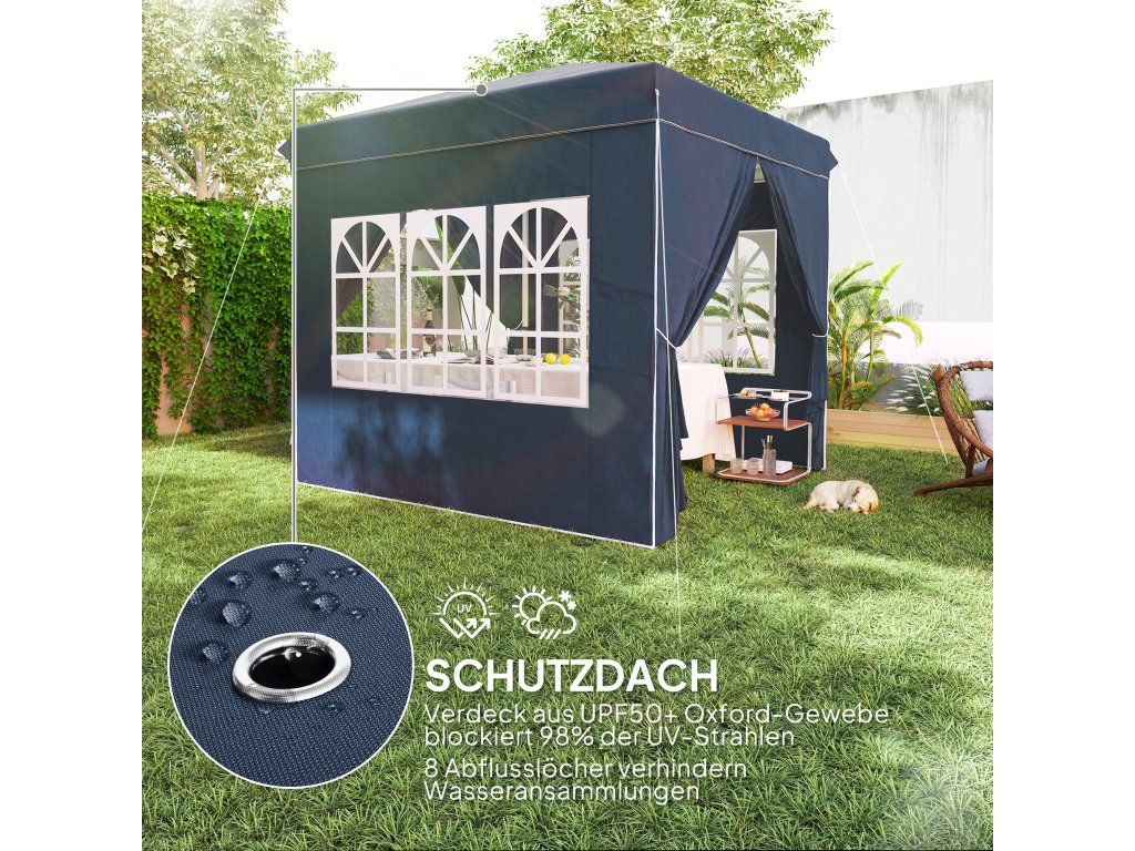 - UV ochrana: Stan je vybaven tkaninou UPF50+ Oxford, která účinně chrání před 98 % UV záření, a má osm odtokových otvorů, které zabraňují stagnaci vody. Skládací altán by se neměl nechávat postavený za špatného počasí