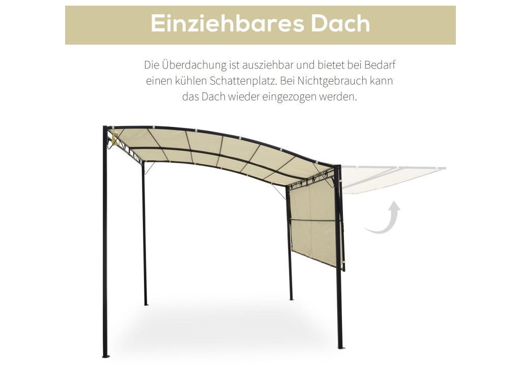 - DOPLŇKOVÁ SKLÁDACÍ STŘECHA: Praktickou střechu pergoly lze v případě potřeby sklopit nahoru nebo dolů, aby poskytovala více stínu nebo lepší ochranu před větrem.