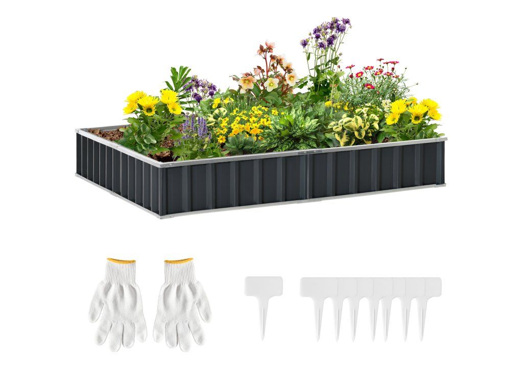 Outsunny DIY ocelový vyvýšený zahradní záhon ve tvaru T se štíty na rostliny a rukavicemi, tmavě šedý pro snadné zahradničení | Aosom.de