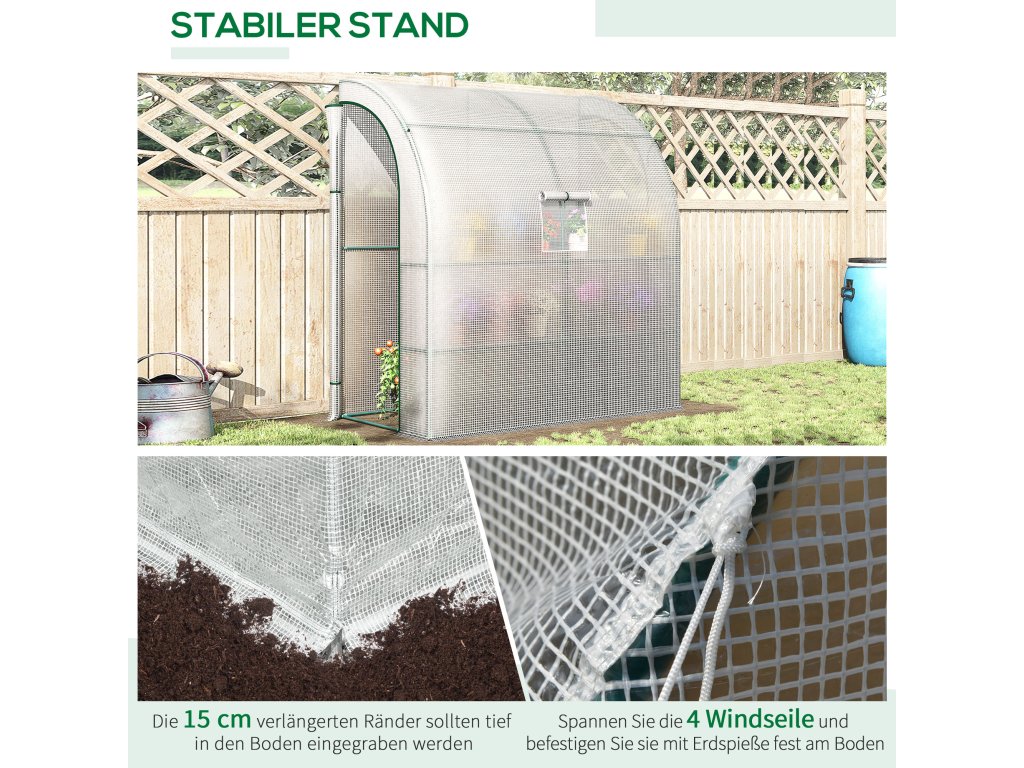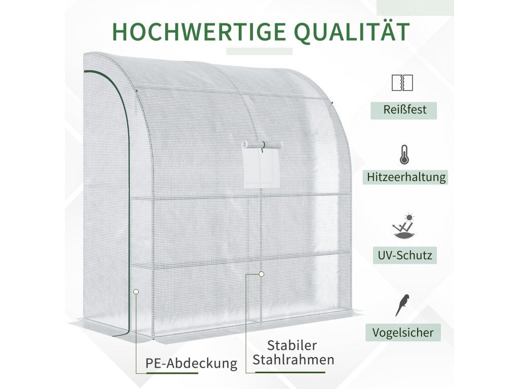 Prodlužte si vegetační období a chraňte své rostliny před chladem a mrazem pomocí skleníku Outsunny. Tento nakloněný skleník se připevňuje k boční straně vašeho rajčatového domku, garáže, stodoly nebo kůlny, čímž zajišťuje bezpečné postavení a mimořádnou stabilitu. Díky rolovacím dveřím a oknům můžete regulovat teplotu, vlhkost a sluneční světlo. Plastový kryt chladicího rámu chrání vaše rostliny před UV zářením, ale propouští dostatek slunečního světla. Vychutnávejte si čerstvou zeleninu, bylinky a domácí rajčata po celý rok.