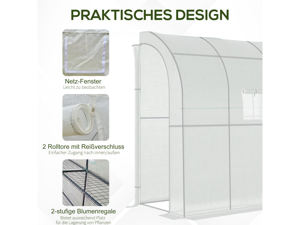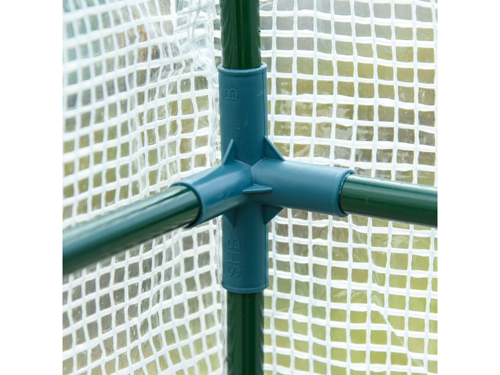 - Rolovací dveře a okna: Náš skleník má dvoje rolovací dveře se zipy pro snadný přístup do interiéru. Všechny dveře a okna jsou vyrobeny ze síťoviny, která zabraňuje přístupu nežádoucích škůdců, reguluje vlhkost uvnitř a zároveň propouští čerstvý vzduch.