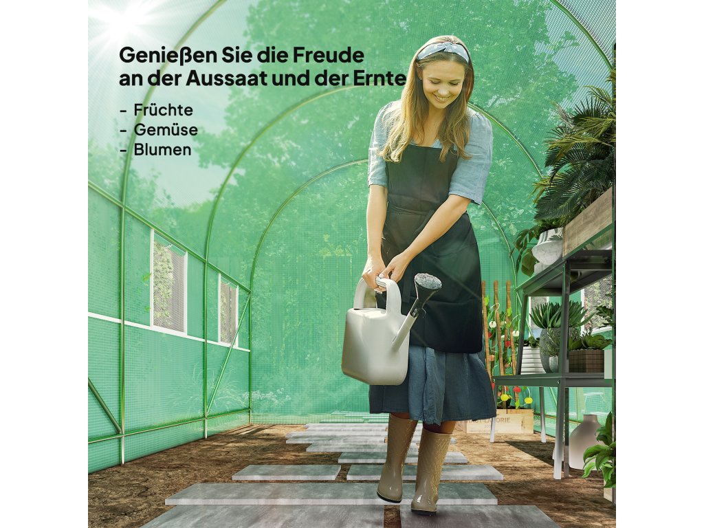 - Ideální skleník: Průhledné fólie jsou průsvitné, takže vaše rostliny budou mít vždy dostatek světla a tepla a zároveň budou chráněny před povětrnostními vlivy a zvířaty. Okna a dveře s dvojitými zipy zaručují dobrou cirkulaci vzduchu.