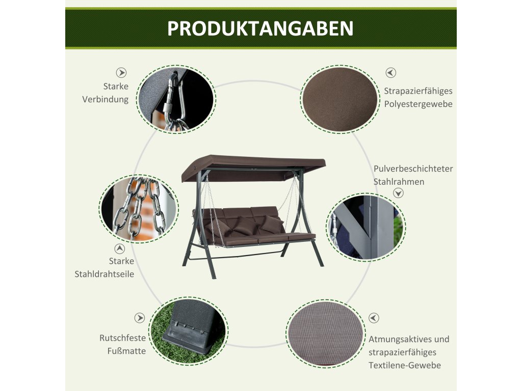 - Vznášejte se jako v oblacích: Pohodlné sedáky a opěradla vybízejí k odpočinku a poskytují dodatečné pohodlí. Vychutnejte si jemný pohyb houpačky a strávte relaxační hodiny venku.