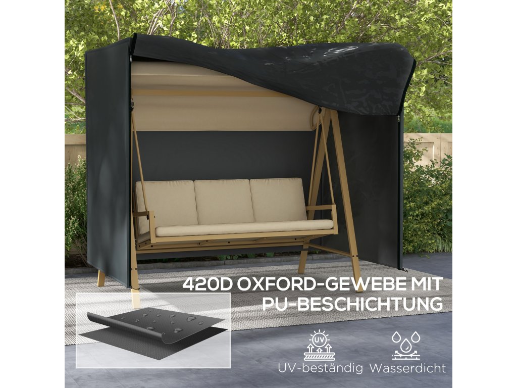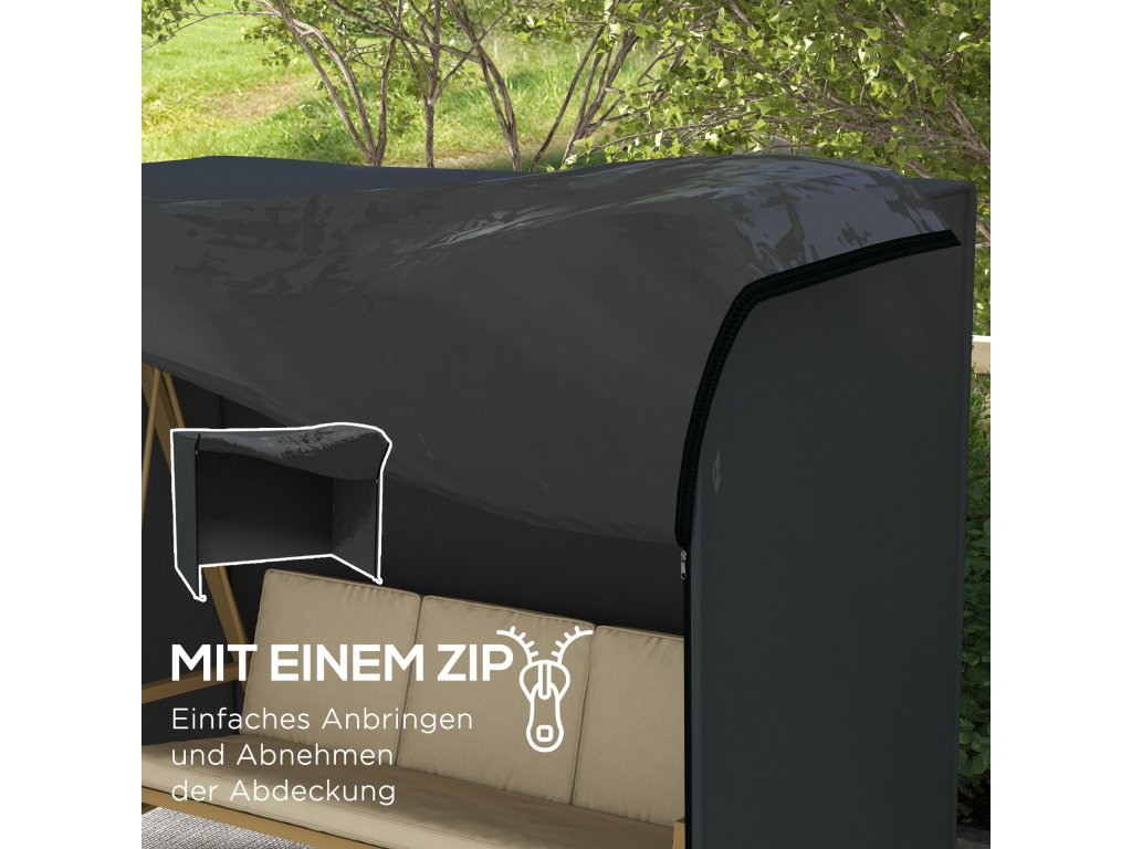 Dokonalá ochrana pro vaši zahradní houpačku! Udržujte svou zahradní houpací lavici i po letech jako novou díky našemu potahu od společnosti Outsunny: tento ochranný potah je odolný proti roztržení, vodotěsný a odolný vůči nečistotám a bezpečně ochrání vaši houpačku před vyblednutím, prachem a ptačím trusem. Díky zapínání na zip lze ochranný kryt připevnit a sundat během chvilky, zatímco ozdobná šňůrka drží kryt bezpečně na místě, takže ho neodfoukne vítr.