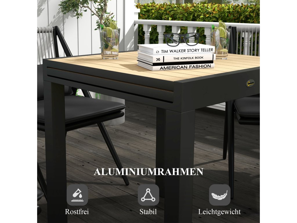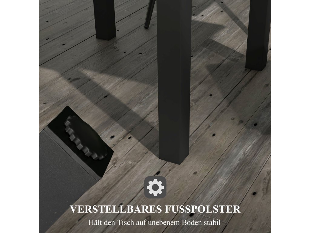 Rozkládací stůl na terasu Outsunny je univerzální stůl, který se přizpůsobí vašim potřebám. Nabízí prostor pro čtyři osoby a po příchodu hostů jej lze snadno rozšířit na šest. Je vyroben z práškově lakovaného hliníku. Je voděodolný, lehký a snadno se používá. Déšť může jednoduše stékat díky klasické konstrukci lamelového rámu. Podnožky balkonového stolu jsou nastavitelné. Přizpůsobí se jakékoli podlahové krytině.