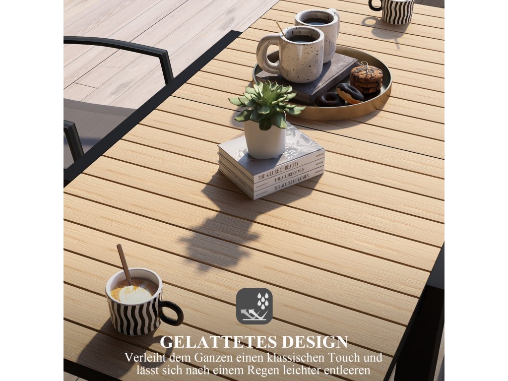 - Elegantní design: Náš rozkládací venkovní zahradní stůl má lamelový povrch, který se snadno čistí. Má rustikální vzhled připomínající piknikový stůl. Nadčasový půvab lamelových podnoží se snoubí s odolností hliníku