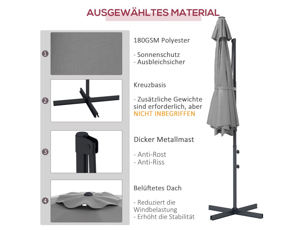 - ✔ POZNÁMKA 1: Požadovaná hmotnost slunečníku 80 kg není zahrnuta. Vhodná hmotnost slunečníku od společnosti Outsunny: 84D-070. Pokud potřebujete odkazy na produkty, kontaktujte prosím zákaznický servis.