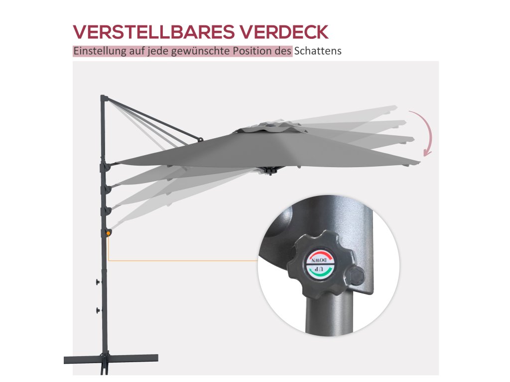 - rozsah otáčení o 360°: otáčením slunečníku v požadovaném směru si vytvarujete plochu stínu podle svých představ