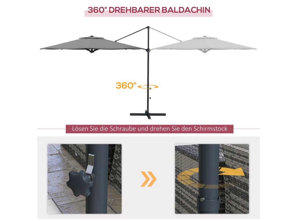 - ✔ Tyč slunečníku se otáčí o 360 stupňů, aby vás chránila před sluncem po celý den