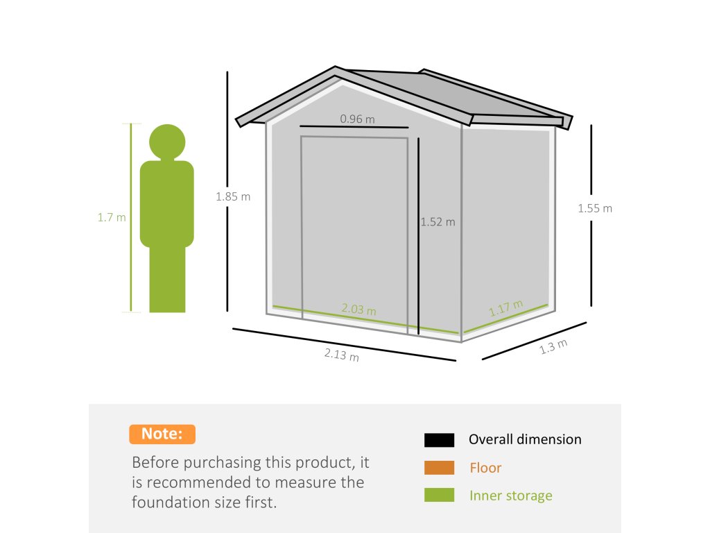 - Údaje o výrobku: Kůlna na dřevo je vyrobena z kvalitního dřeva, které je vhodné pro použití v domácnosti: Celkové rozměry: 213L x 130W x 185H cm, vnitřní rozměry: 203L x 117W x 185H cm. Poznámka: Před zakoupením tohoto výrobku si pečlivě změřte podklad ve svém venkovním prostoru.