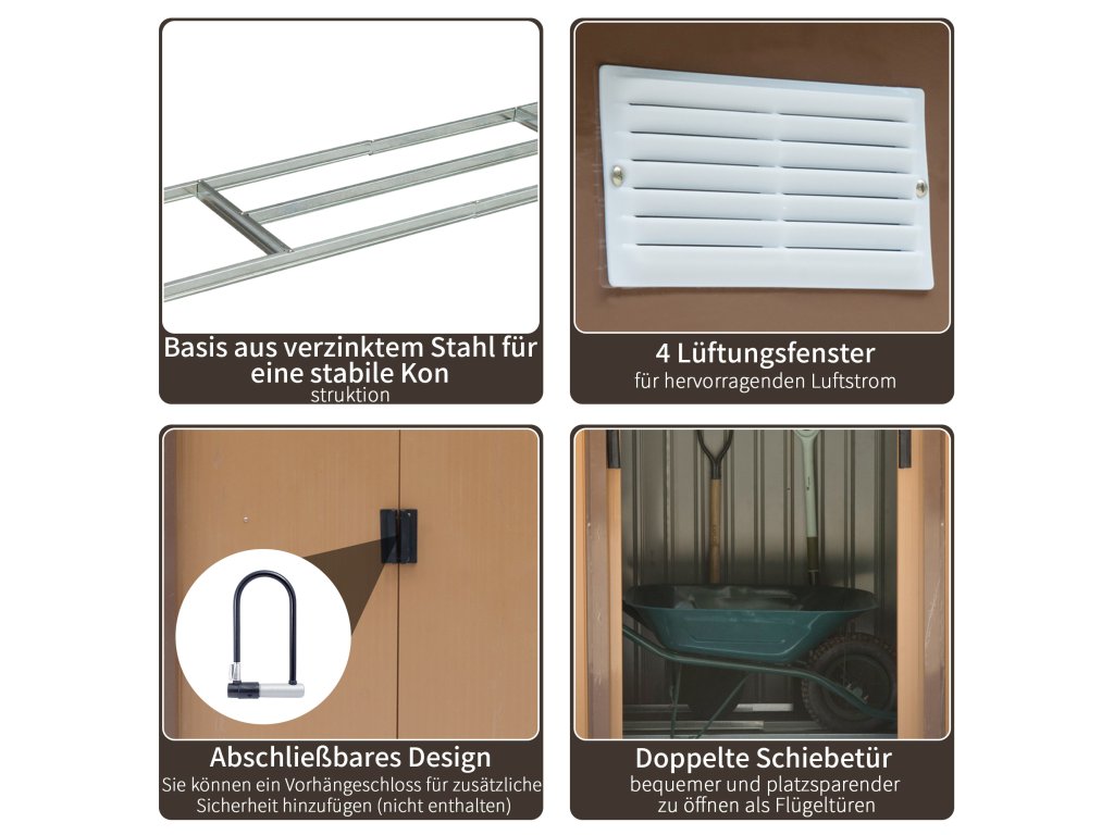 Ještě nemáte zahradní přístřešek na zahradní nářadí? Pak je tento přístřešek na nářadí od společnosti Outsunny ideálním řešením! Přístup do kůlny na nářadí je přes dvoje posuvné dveře a kůlna na nářadí má robustní, nerezavějící základní rám z pozinkované oceli. Protože je kůlna na nářadí vyrobena z kovu, je mimořádně robustní a ideální pro vaši zahradu. Velmi prostorný, bezpečný před vlhkostí a dobře větraný: takto bezpečně uložíte zahradní kůlnu na nářadí!