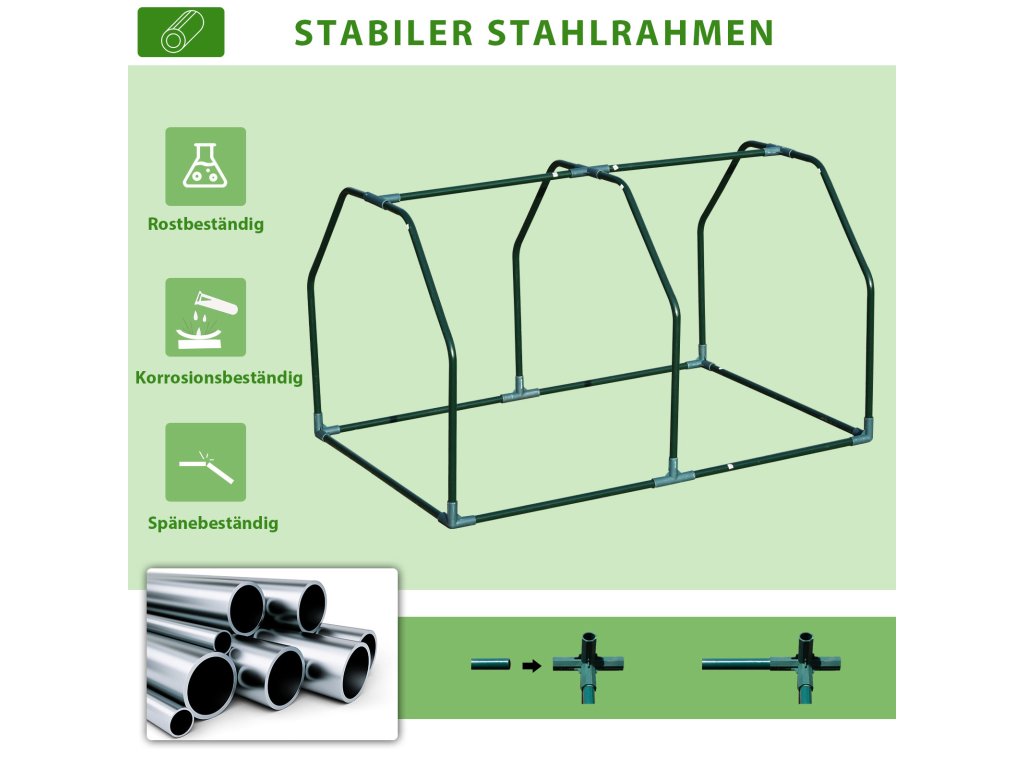 - Kovový rám: Mini skleník je podepřen stabilním a pevným kovovým rámem. Pět příček lze k sobě připevnit pomocí držáků. Materiál je robustní a odolný.
