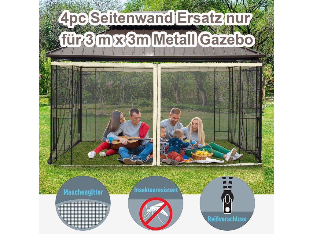 - Podrobnosti o výrobku: Naši moskytiéru lze použít univerzálně. Naše síťka proti komárům se hodí do standardních čtyřpanelových altánů. Jedná se pouze o síť; kovový rám a vrchní část stříšky nejsou součástí dodávky. Vhodné pro altán 3x3