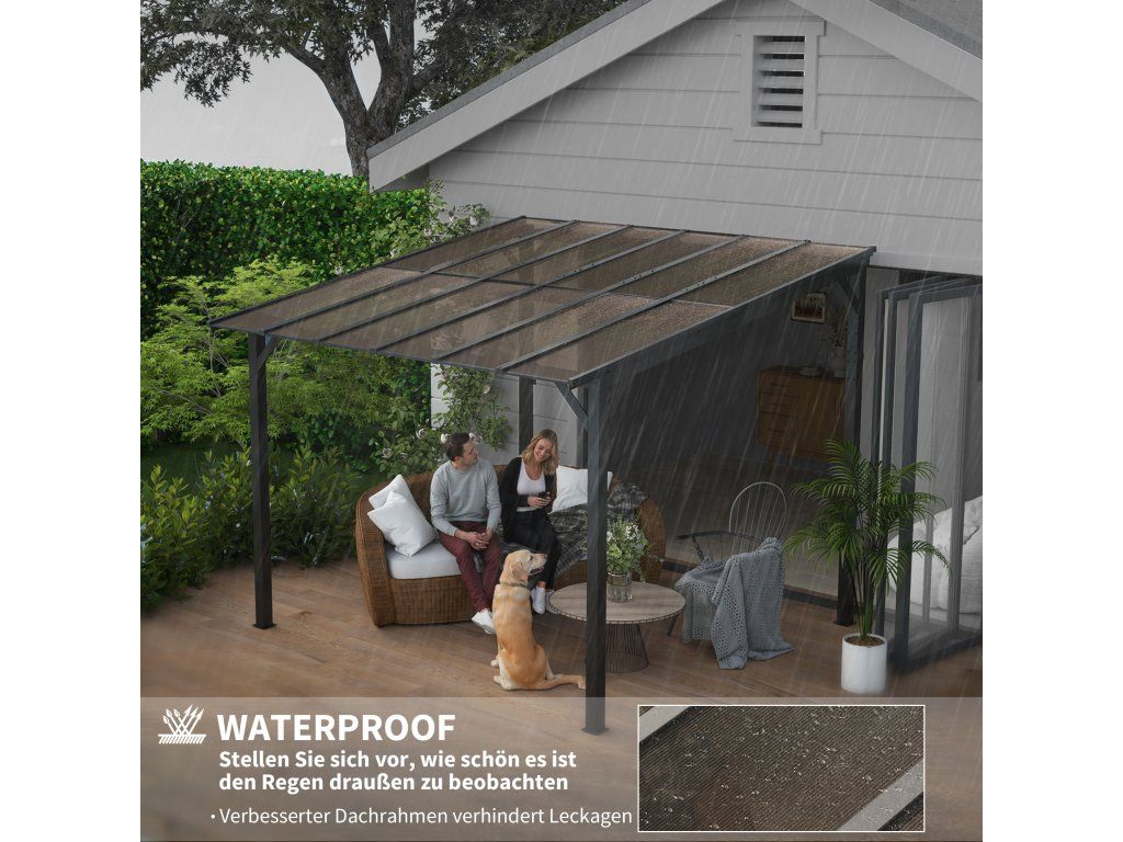 - Vodotěsná střecha: Plně vodotěsný altán vám umožní sedět v suchu a pohodlí i za nepříznivého počasí