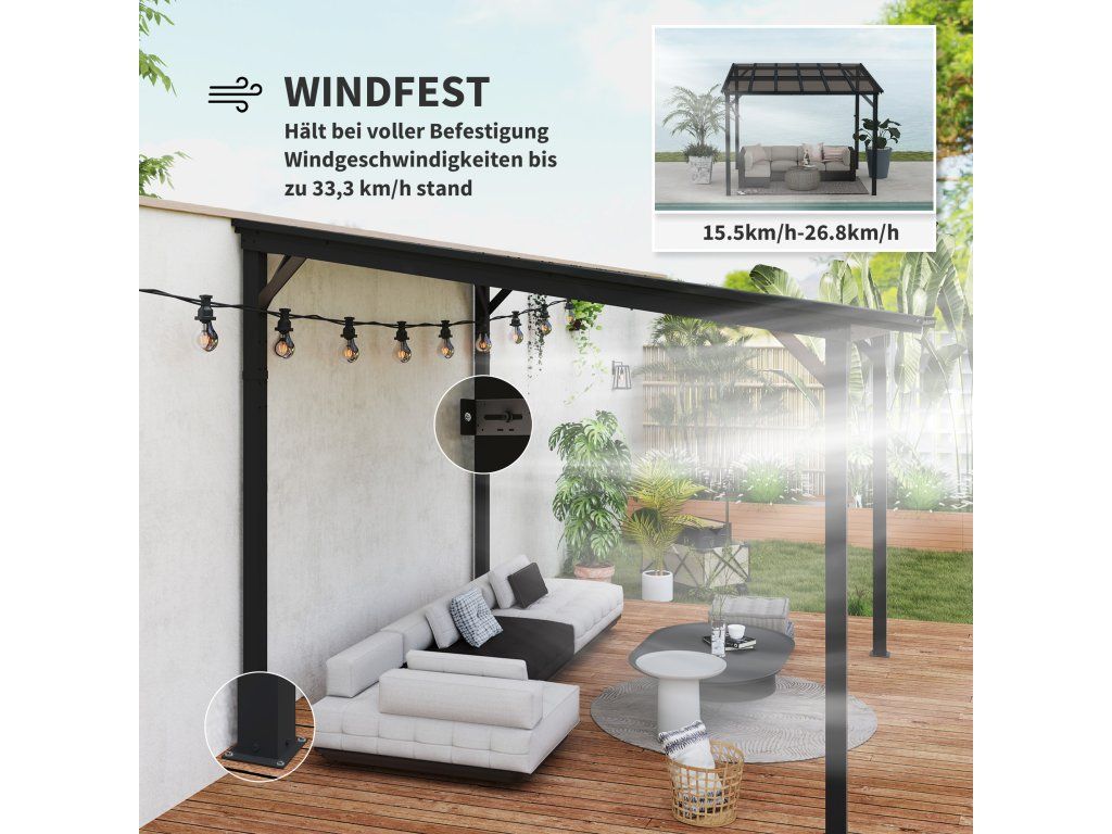 - ✔ Pergola je bezpečně připevněna ke stěně a zemi, takže odolá i silnému větru