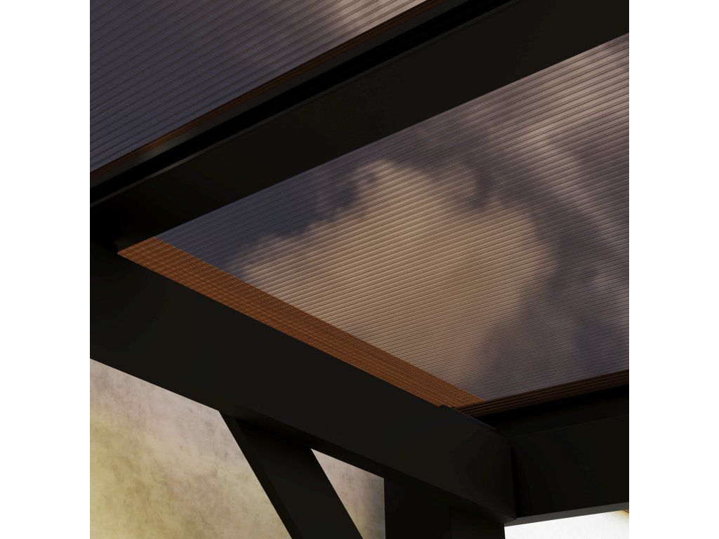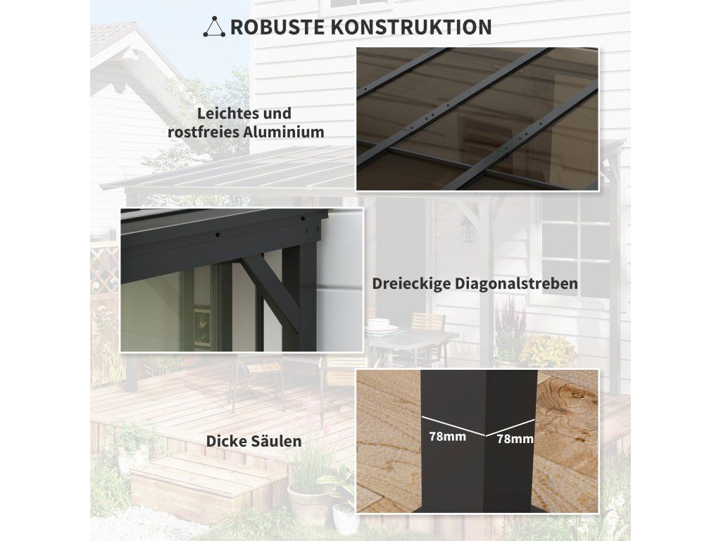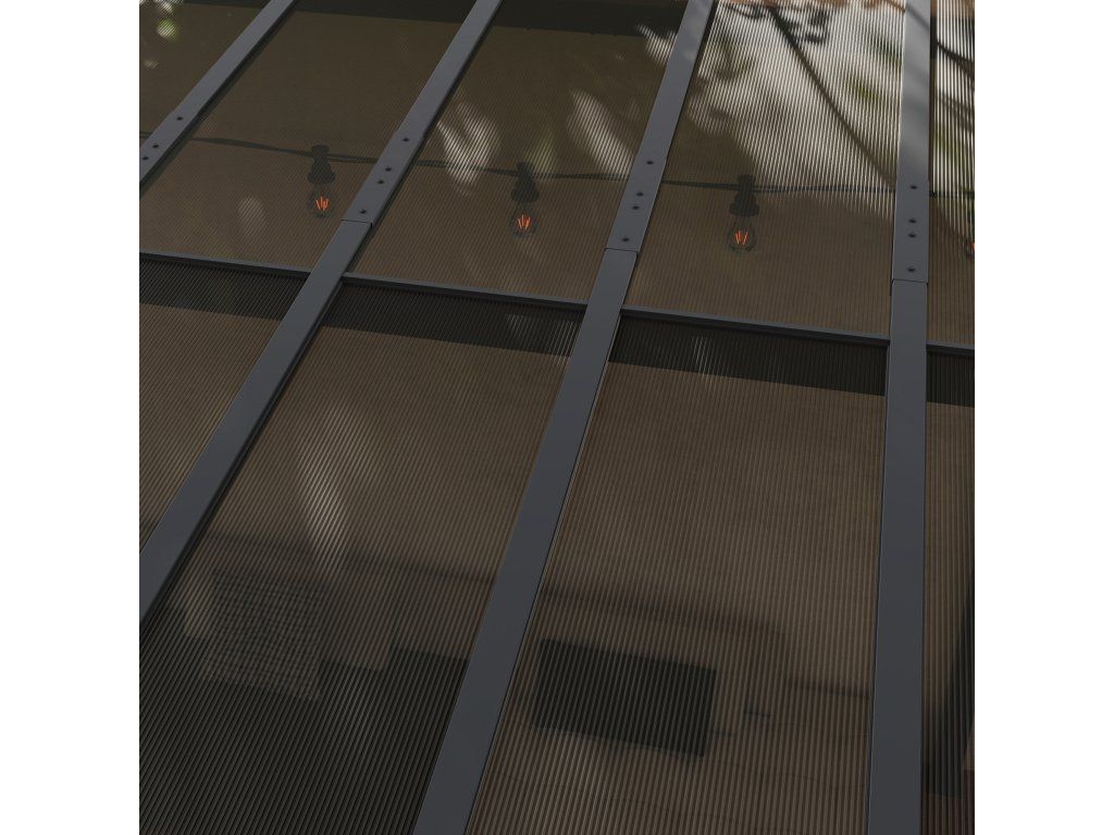 - Robustní konstrukce: Kryt terasy je vybaven silnými kovovými sloupky (78 x 78 mm) a vyztužen trojúhelníkovými diagonálními výztuhami, které zajišťují trvalou stabilitu a odolnost. Lehký hliníkový střešní rám odlehčuje spodní část rámu