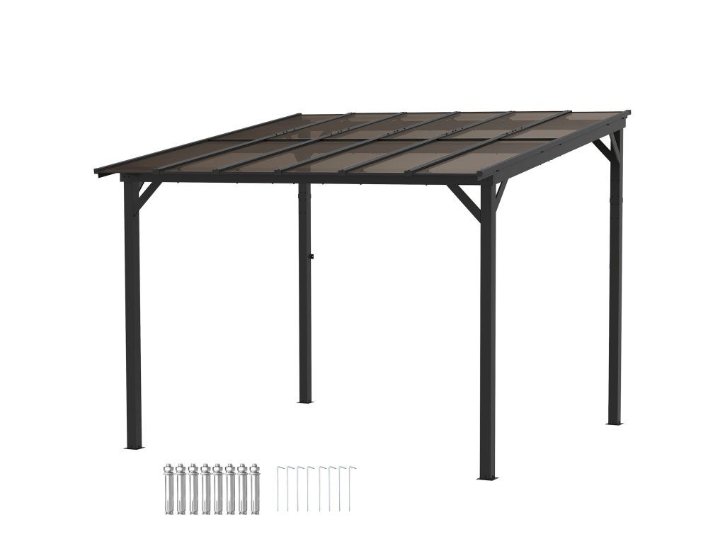 Outsunny pergola pavilon cca 3x3m, voděodolný, stabilní, zimní zastřešení terasy s UV ochranou 50+, nástěnný kovový zahradní pavilon, ochrana před sluncem pro zahradní terasu balkon tmavě šedá
