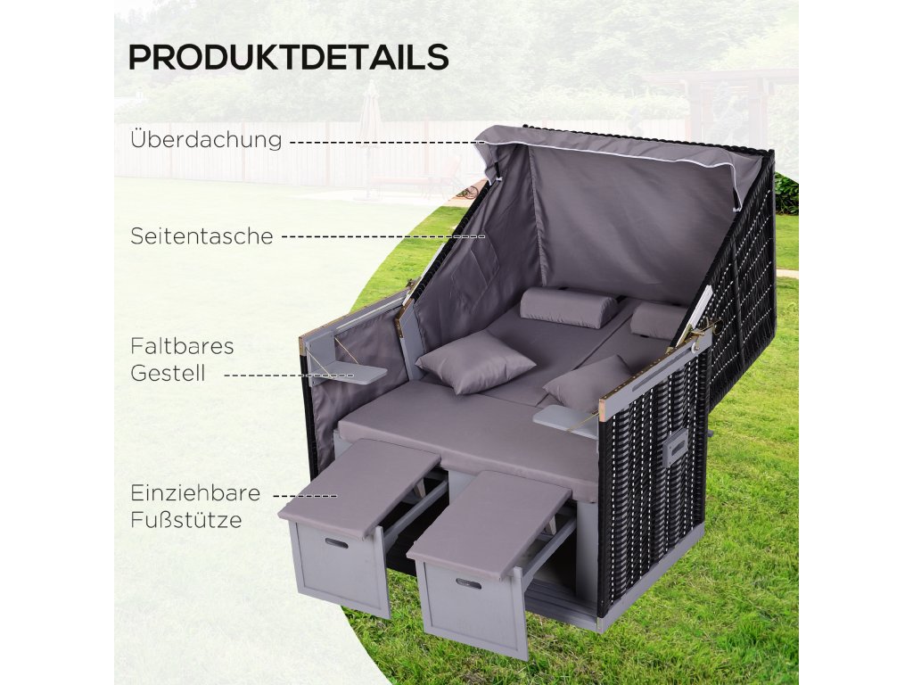 Elegantní a zároveň útulné: plážové lehátko Outsunny pro dva je skutečným lákadlem. Vypadá stejně dobře na terase jako na zahradě a nabízí vše, co byste od plážového křesla na dovolenou očekávali: dva praktické skládací stolky, výsuvné podnožky, skládací sluneční stříšku a vícestupňově nastavitelné opěradlo. Přeneste si ten pravý plážový a prázdninový pocit do pohodlí svého domova!
