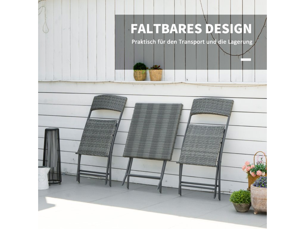 - Elegantní balkonová sada: Černá sada balkonového nábytku obsahuje dvě skládací židle a stylový ratanový stůl a je ideální pro vaše vnitřní i venkovní prostory.