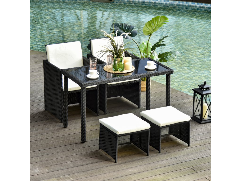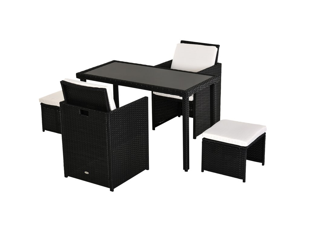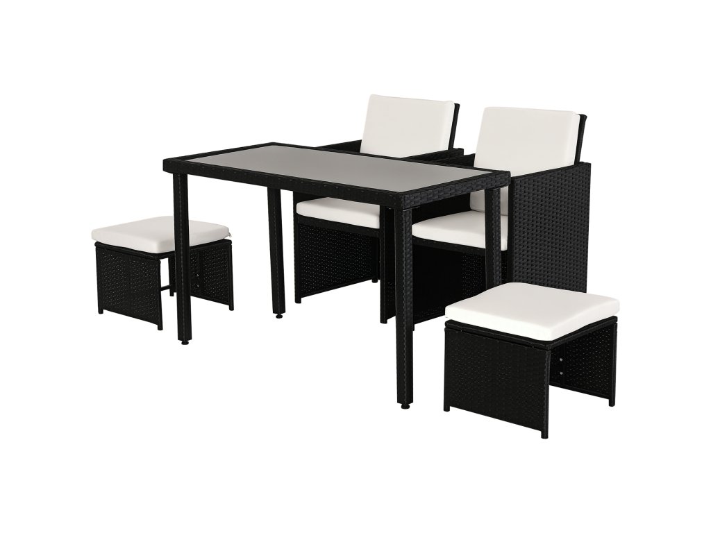- ✔ Sedací souprava pro vnitřní i venkovní použití, skládající se z 1 stolu + 2 židlí + 2 taburetů