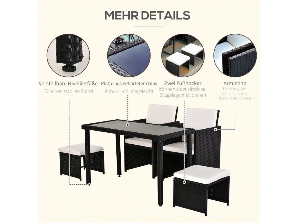 - 11DÍLNÁ SADA SEDACÍCH PROSTŘEDKŮ: Sada obsahuje stůl, dvě židle a dvě stoličky s polštáři na sedáky. Vhodné pro vnitřní i venkovní použití.